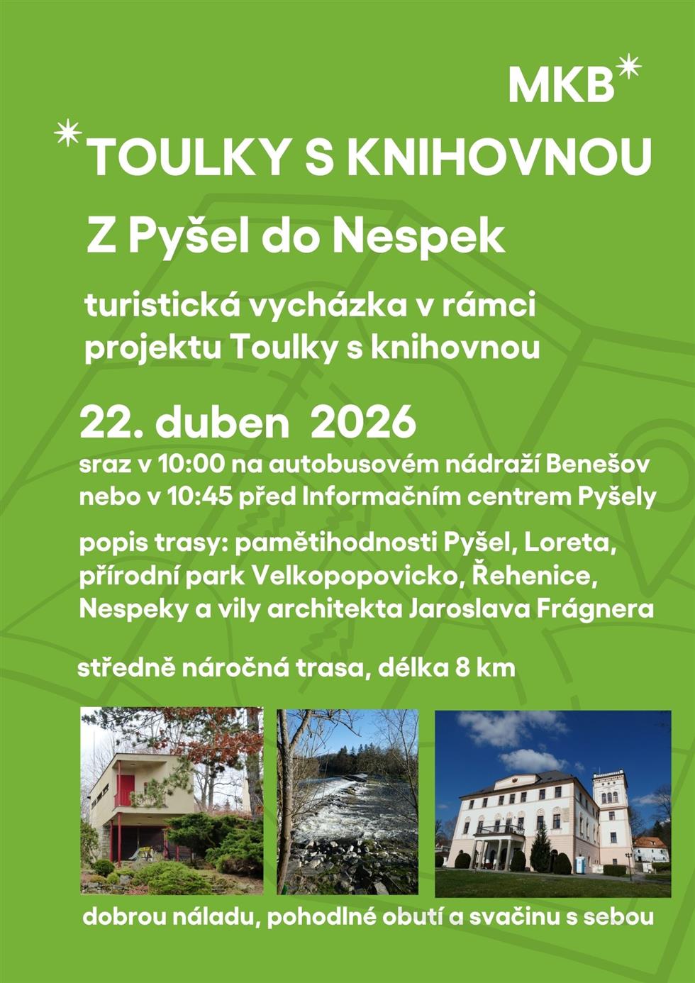 Turistická vycházka v rámci projektu Toulky s knihovnou. Sraz v 10:00 na autobusovém nádraží Benešov nebo v 10:45 před Informačním centrem Pyšely